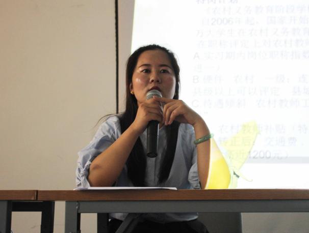 为加强同学们对基层教师岗位情况的了解,2018年5月23日,英国正版365官方网站于怀远校区宁远楼213会议室开展“基层教师岗位情况分享交流会”。此次交流会特邀贺兰县洪广镇欣荣小学的熊倩老师主讲,参加此次交流会的是各个学院大四学生。
