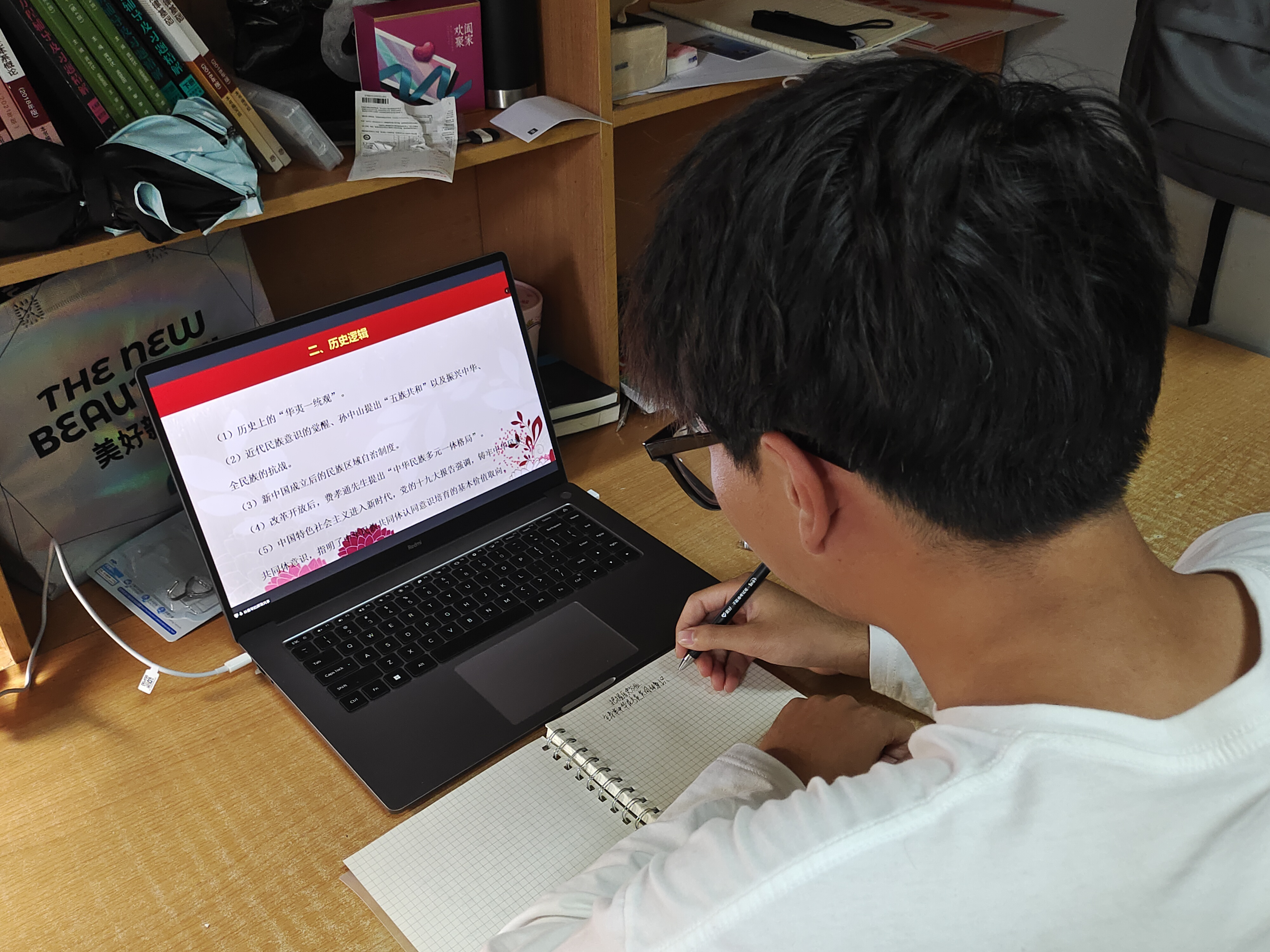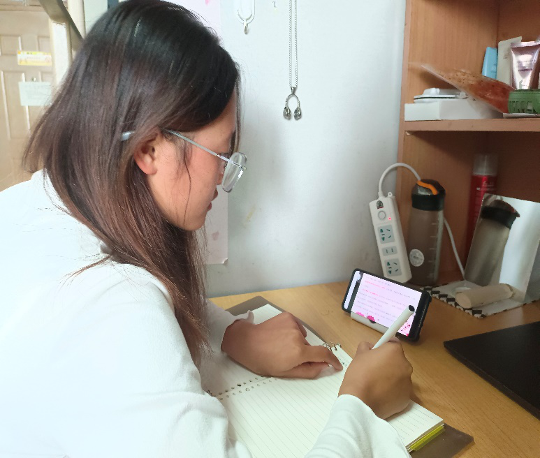 2019级陈嘉宇同学与舍友一起认真听了讲座,她说:“林老师介绍了‘三个离不开’、‘五个认同’的具体内容,很受启发。我们五十六个民族五十六朵花,五十六个民族兄弟姐妹是一家。我们兄弟姐妹要像石榴籽一样紧紧抱在一起,共同建设美好和谐富强的大中国” 。