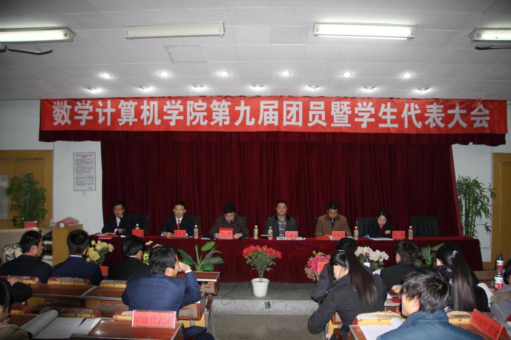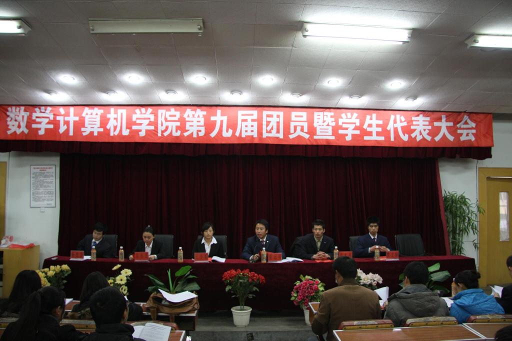 下午1时,数学计算机学院第九届团员暨学生代表大会顺利完成预定的各项议程,在二楼报告厅胜利闭幕。大会主席团发出倡议书,号召全院学生,以此次大会的成功举办为契机,深入学习贯彻十七届五中全会精神和“西部大开发”精神,时刻树立主人翁意识,创新载体,丰富内涵,勤勤恳恳,踏实工作,为数学计算机学院团学工作的新局面奋勇前进!