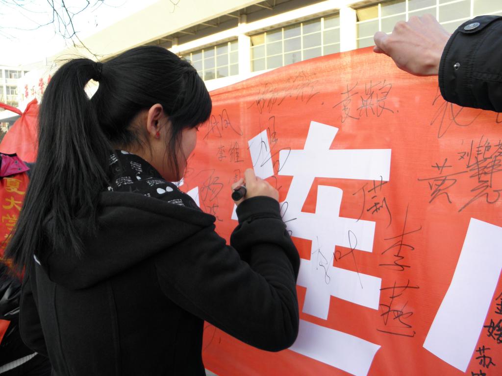 活动于下午五时开始,在组织学生的引导下,北校区数计学院和兄弟学院的学生积极响应,或是在红色的横幅上签上姓名,表达自己关爱农民工子弟的承诺;或是向募捐箱里捐出自己的零用钱,传递自己的关爱之情;或是捐出自己的课外读物与衣服,向农民工子弟送去自己真诚的关怀。