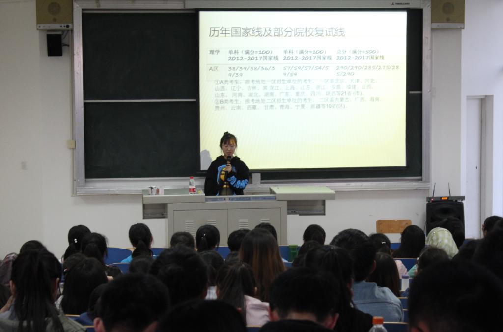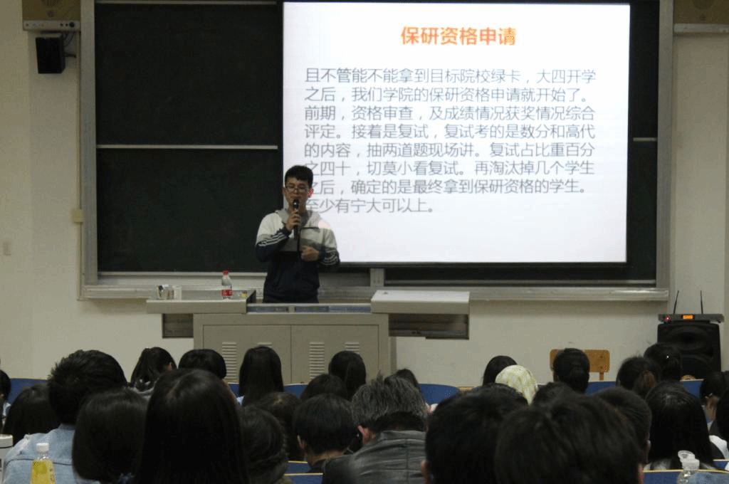 三位学长学姐分享了他们的考研及保研历程,分别介绍了考研各科目的学习经验,关于报考学校的选择,考研的心态等等,使在座的同学认识到艰苦卓绝考研之路也是有理可循的。成功争取到保研资格的李军霞学姐和王震学长为大家分别讲述了夏令营保研历程,包括夏令营的申请技巧,各高校的考核方式及报考学校与未来就业的关系问题等做了详尽的阐述,使对保研不甚了解的同学拨云见日,有了一定了解。