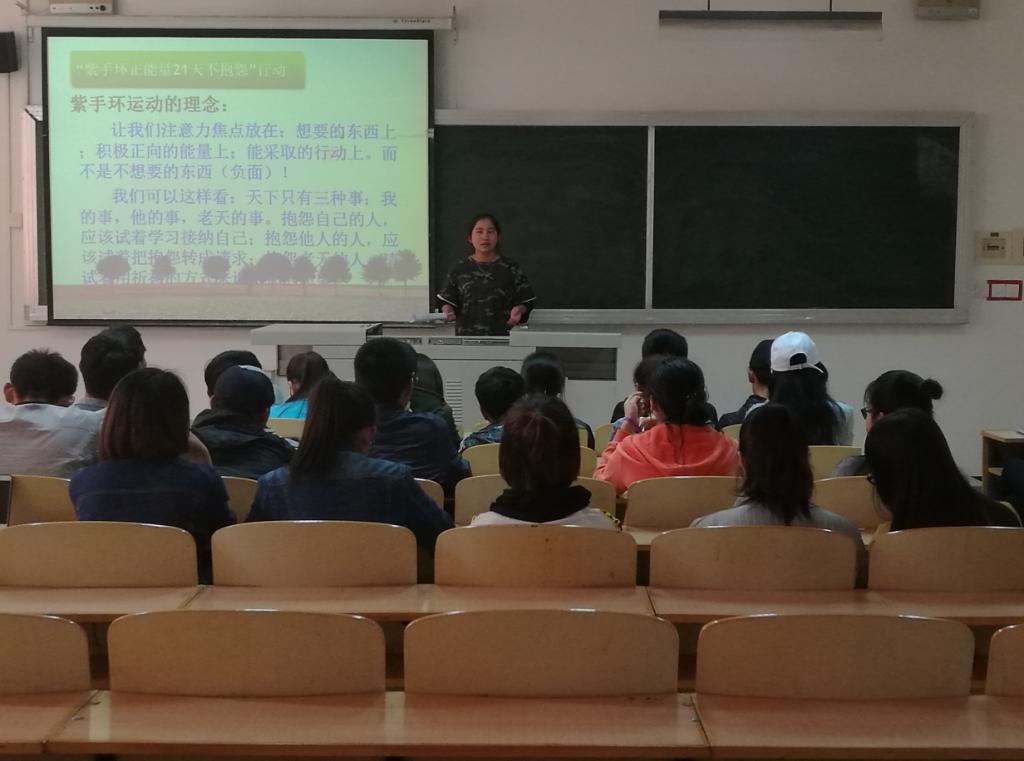 为普及心理健康知识,树立积极健康意识,形成“不抱怨”的积极正向行为模式,创造充满心灵正能量的校园氛围。5月3日下午3:30,英国正版365官方网站2014、2015、2016级各班以班级为单位,在怀远校区综合楼及一教开展了以“紫手环正能量 21天不抱怨”为主题的心理健康教育班会。