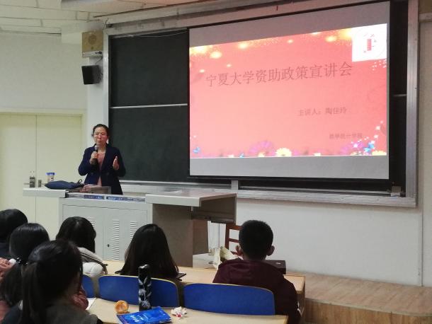 会议伊始,陶老师就高校学生资助工作的重要意义做出了概括,并告诫同学们合理使用助学金。随后,又为同学们介绍了高校家庭经济困难学生资助政策体系的主要内容,并一一为同学们做出了详细的解释。紧接着,她对一般贫困与特殊贫困的认定标准做出了详细的区分,以及讲解了贫困资助认定的流程。在国家励志奖学金方面,陶老师表示,该奖学金旨在奖励品学兼优且家庭经济困难的同学,同时,这类同学要获得宁夏大学一、二等综合奖学金,每门成绩不低于65分,并且无挂科记录。随后,又为同学们介绍了获得国家奖学金及其他奖学金的条件。陶老师对国家助学贷款进行介绍后表示,学习固然重要,但同学们还是要积极参加一些学校、学院的活动,锻炼个人能力,提高综合素质。