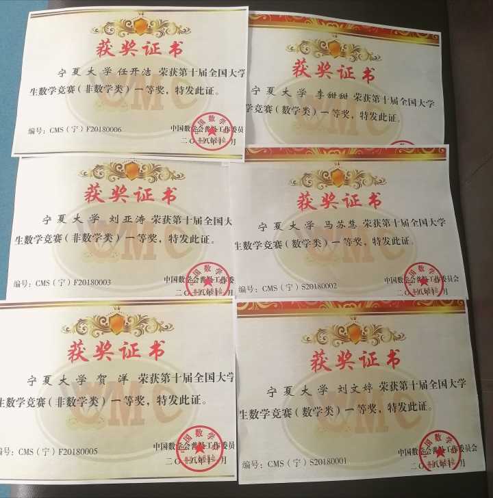 据了解,我校学子曾于2009年首届全国大学生数学竞赛中荣获一等奖,在第八届全国大学生数学竞赛中,取得了数学类二等奖的好成绩。宁夏大学在近些年不断在宁夏赛区预赛和全国决赛中取得如此优异的成绩,离不开英国正版365官方网站数学竞赛辅导答疑团队老师们的辛勤付出和无私奉献。同时,也要感谢学校对数学基础教育的高度重视和鼓励。这一张张证书,不仅是参赛者个人的荣誉,更是英国正版365官方网站的荣誉,体现我校数学基础课程教学的优异效果!