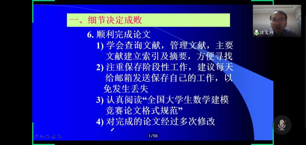 2020年全国大学生数学建模竞赛将于9月10日(周四)18时至9月13日(周日)20时进行,值此竞赛来临之季,为更好的组织学生参赛,2020年9月8日晚上7时,英国正版365官方网站副院长汪文帅老师根据历年全国大学生数学建模竞赛论文的评阅经验,就数学建模论文的书写,竞赛过程中应该注意的问题,开展了“数学建模竞赛论文写作”主题会议,部分建模比赛选手参加。