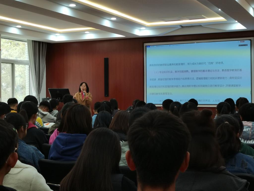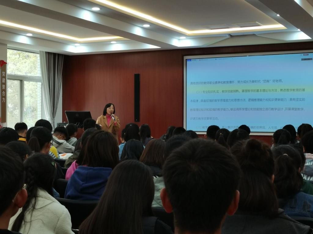 讲座开始,王丽老师首先讲述了数学与应用数学(教师教育)专业的存在价值以及学校自开设数学专业以来取得的辉煌成就,老师说到:对于师范专业的学生们来说,要求每位同学要提升自己的专业素养和师德素养,在以后的学习中不忘初心,能够努力学习专业知识,让自己走得更高更远,才能在自己的工作中熠熠闪光,这才应该是我们每一个人选择这个专业的初衷。
