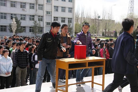4月21日下午14:00,在五四广场上,数学计算机学院全体同学在学生工作办公室的组织下,排列整齐,井然有序,向在玉树地震中遇难的同胞默哀三分钟,全场气氛庄重,肃穆感人。默哀仪式后,广大同学纷纷将一份份爱心投入捐款箱中,几元、几十元到上百元,汇聚成每位同学对灾区人民的深情牵挂。