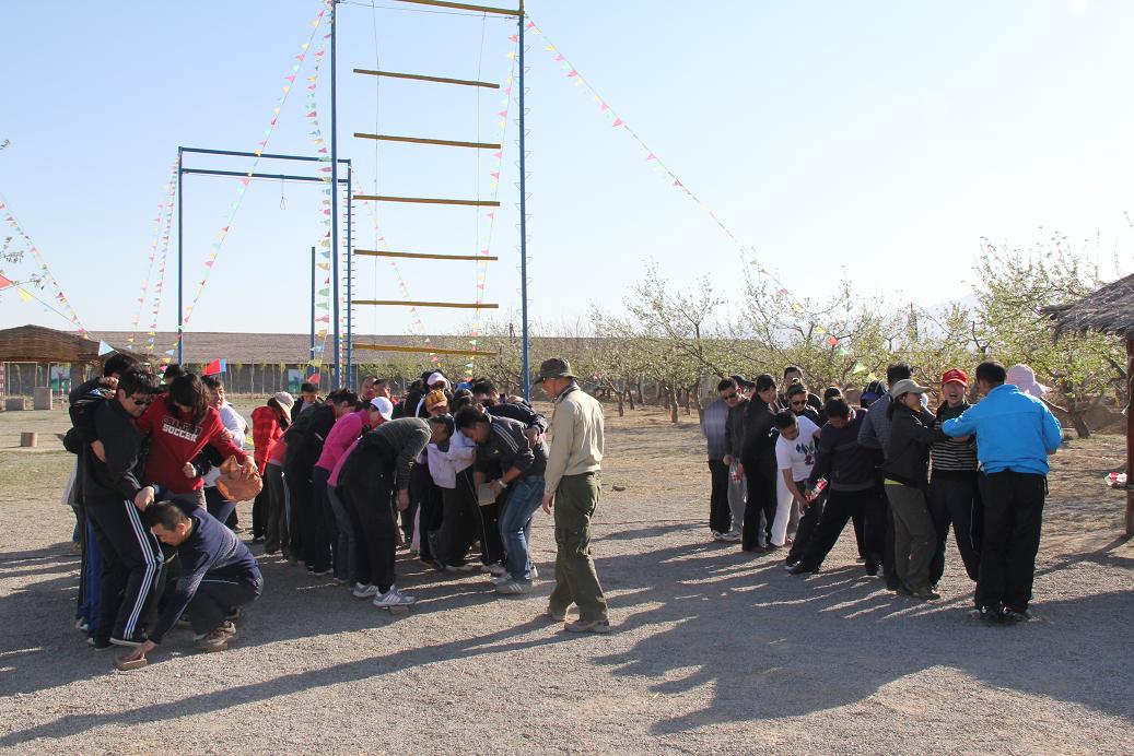 当队伍到达兰一山庄,首先映入眼帘的是盛开着大片的桃花林,处处绿意盎然,一眼望去,心旷神怡,大自然的美使得大家的心情顿时舒畅了,平时工作和生活中的压力猛然间都消失了。来到拓展场地后,各位老师挑战自我的心情迫不及待,蠢蠢欲动。在教官的讲解和指导下,大家一边进行破冰热身活动,一边了解素质拓展的意义和目的。随后,整个队伍被分成了4支挑战队,各队集思广益,为自己的队伍选出了队长、命名了队名、画出了Logo、设计了口号和队歌,各队经过一番激烈的比拼演练后,依次进行了激情传递滚球、泰坦尼克号逃生、强渡金沙江等科目。特别是在强渡金沙江科目中,24位老师踊跃担当了河中的“桥墩”,在严明的规则和限定的时间内,他们强忍着队员们的踩踏,汗水不停的从脸颊流下,一遍又一遍,一个又一个地把队员们运到对岸,粛严、顽强、壮烈的场面十分感人,使许多队员当场禁不住流下了眼泪,特别是最后,当仅剩下5名“桥墩”时,大家都纷涌跳进了“金沙江”,筑起了一道坚固的人桥,使奋战到最后的“勇士”顺利到达彼岸。那一刻,全场沸腾了,大家奔走欢呼,为挑战成功发自肺腑的欢呼,为我们这个协作互助的团队而忘我的欢呼——我们成功了,成功了!在欢呼中我们结束了所有拓展科目。