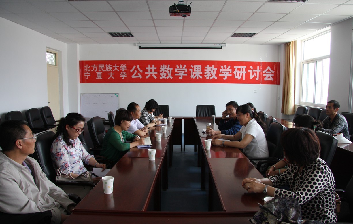 在研讨会上,北方民族大学基础部主任田俊忠和宁夏大学数学计算机学院副院长韩惠丽分别介绍了两校公共数学教学的基本情况。接下来,北方民族大学基础部数学教研室主任叶志萍教授和宁夏大学数计学院大学数学教学中心主任许新忠教授分别做了交流发言。随后,与会的教师就公共数学的课程设置、课程建设、教学改革等问题进行了深入的交流与探讨。会议商定双方今后将定期不定期地召开类似会议,深入推进两校在教学和工作方面的交流与合作。