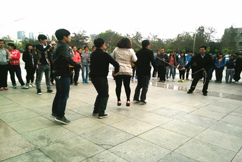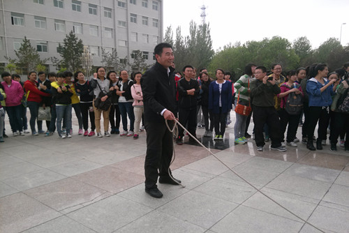 随后,乔晓军副书记一行来到了B区五四广场,这里学院学生正开展着关于“三走”课外实践主题活动。赛场上,同学们正激烈地进行着“猫捉老鼠”的跳绳趣味运动游戏。在同学们的簇拥下,老师们也加入到游戏的行列中来,师生共组成八个参赛队,游戏中你方唱罢我登场,比赛现场加油声、呐喊声此起彼伏,将活动推向一个又一个的高潮,比赛最终在同学们的欢声笑语中落下来帷幕。