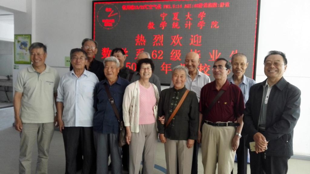 雨过天晴,秋风飒爽。8月26日上午,我们迎来数学系62级毕业50周年返回母校的各位校友。在座谈会上赵利宁副书记介绍了宁夏大学的整体发展情况,学院党委书记刘富祥介绍了学院58年来的发展。校友们对学校的发展倍感振奋,认为不虚此行,为母校的发展感到骄傲。校友们回顾了在当时条件艰苦的情况下为宁夏的社会发展和建设培养了许多人才。希望母校发扬吃苦耐劳、一丝不苟精神,把宁夏大学办成一流大学。随后校友们到贺兰山校区学生食堂回味学生时代食堂生活,到学校三个校区参观校园。