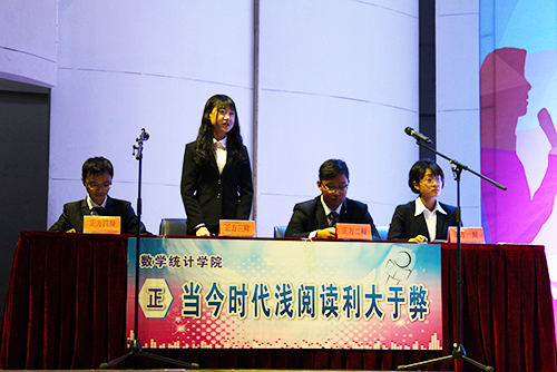 正方英国正版365官方网站代表队与反方资源环境学院代表队围绕“当今时代浅阅读利大于弊还是弊大于利”展开了巅峰对决。双方辩手慷慨激昂,唇枪舌战,步步紧逼又游刃有余,思想的火花在赛场上碰撞,绽放出绚烂的光芒。英国正版365官方网站代表队思路清晰,显示出了理科生善于逻辑推演,思维缜密的特点,一展数学学子的风采。经过评委的细致研究,最终英国正版365官方网站队以373分惜败于对手的377.33分,获得了亚军。英国正版365官方网站15级数学与应用数学(教师教育)专业马敏同学和16级信息与计算科学专业陈凯泽同学由于在整个赛程中优异的表现双双斩获了“最佳辩手”荣誉称号。