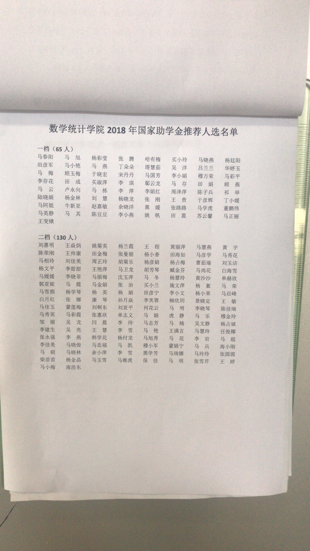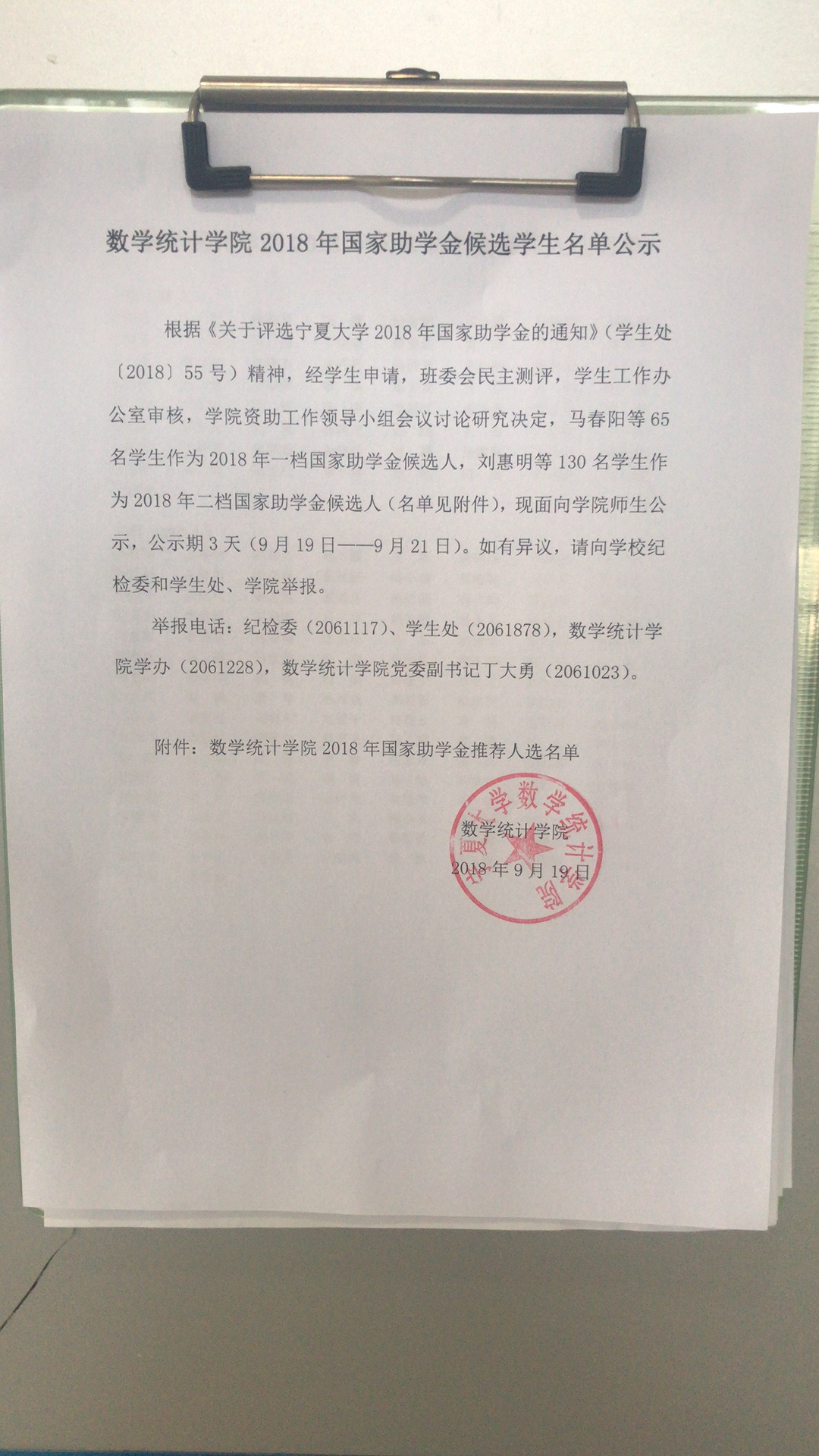 根据《关于评选宁夏大学2018年国家助学金的通知》(学生处〔2018〕55号)精神,经学生申请,班委会民主测评,学生工作办公室审核,学院资助工作领导小组会议讨论研究决定,马春阳等65名学生作为2018年一档国家助学金候选人,刘惠明等130名学生作为2018年二档国家助学金候选人(名单见附件),现面向学院师生公示,公示期3天(9月19日——9月21日)。如有异议,请向学校纪检委和学生处、学院举报。