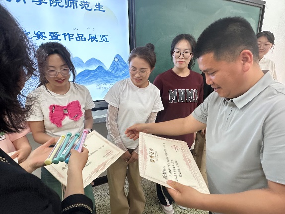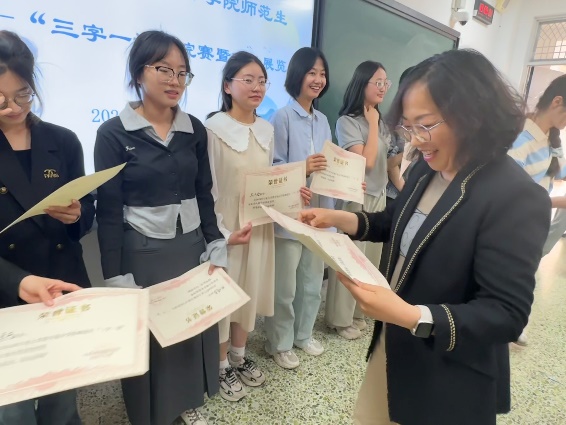 最后,学院副院长赵秉新做了总结点评,在充分肯定各位参赛选手表现的同时,强调了学院对此次比赛的重视和大力支持,他指出要将 “三字一话”比赛融入到课程中去,更广泛,更常态的让所有同学参与进来,切实提高师范生技能。