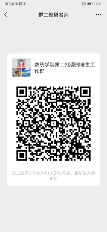 4月6日,确认接受复试的调剂考生加入“数统学院第二批调剂考生工作群”。群昵称请改为“学硕(或专硕)+姓名”。