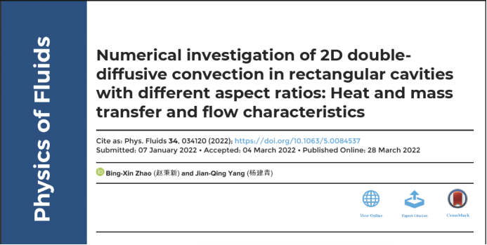 1.《Numerical investigation of 2D double-diffusive convection in rectangular cavities with different aspect ratios: Heat and mass transfer and flow characteristics》全文链接:https://doi.org/10.1063/5.0084537