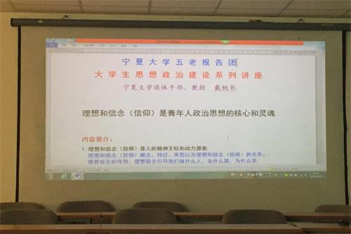 【数学计算机学院 王泽洋\文\图 】 4月29日下午,宁夏大学“五老”报告团戴桃书教授在数计楼213室为数计学生党员做了以“理想和信念(信仰)是青年人政治思想的核心和灵魂”为主题的报告会。