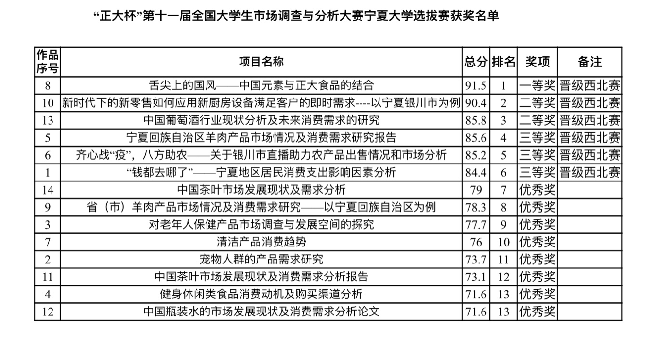 由英国正版365官方网站举办的“正大杯”第十一届全国大学生市场调查与分析大赛宁夏大学选拔赛工作已经圆满结束,各参赛团队经过为期6个多月的市场调查实践准备,共有14组作品提交给组委会,经评审专家对各参赛团队提交的调研报告和展示答辩进行评审、打分,共评出获奖作品14项,其中:一等奖1项、二等奖2项、三等奖3项、优秀奖8项。总分前6名的参赛作品晋级“正大杯”第十一届全国大学生市场调查与分析大赛西北选拔赛。