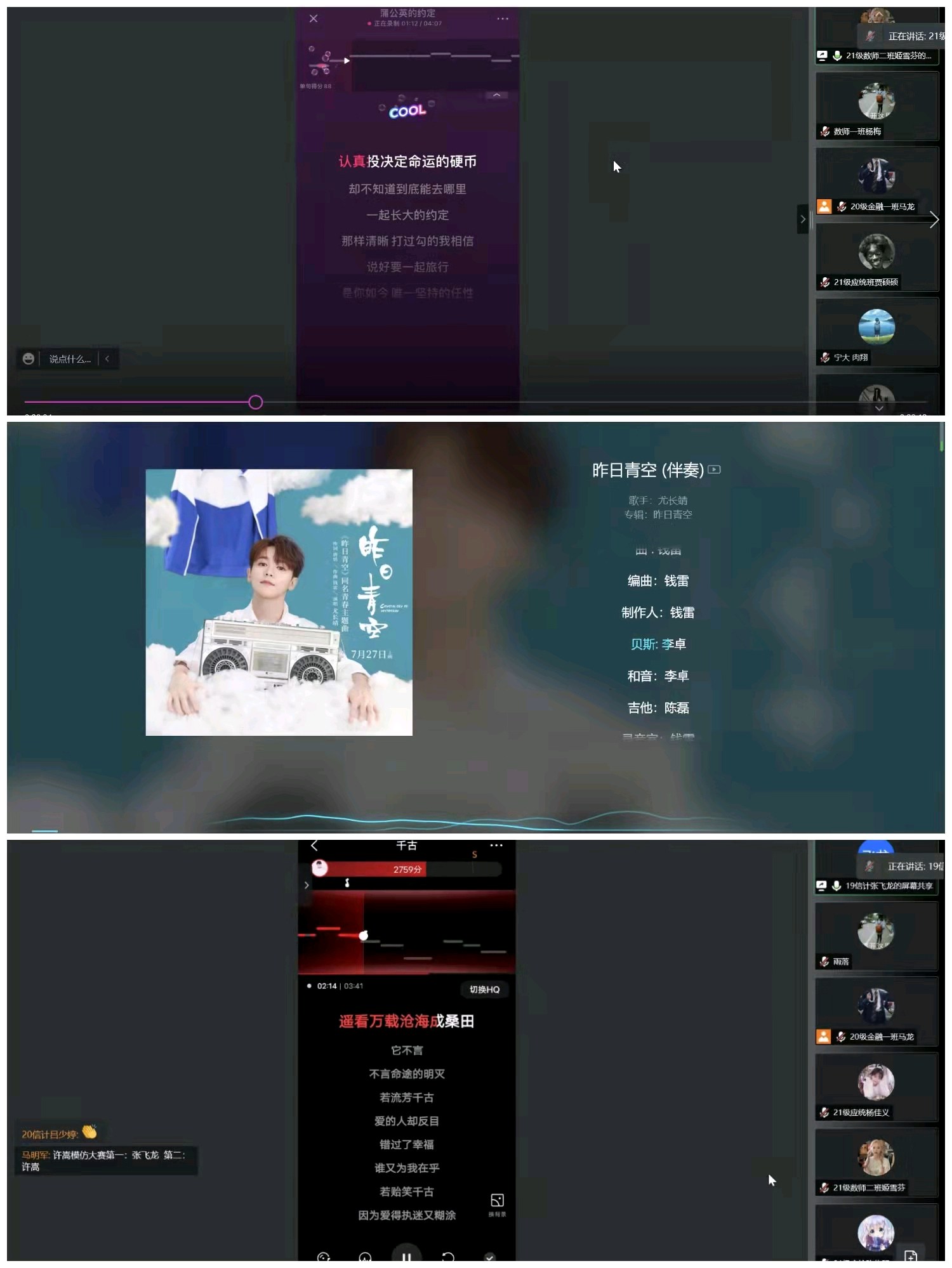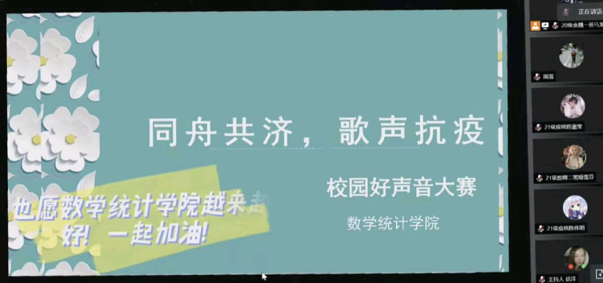 11月3日晚6时30分,初赛拉开帷幕。疫情当前,数统学子动情演唱《国家》、《微微》、《追光者》等歌曲,引起同学们共鸣。一首首悦耳的歌曲萦绕耳畔,表现了英国正版365官方网站学子积极向上的精神风貌。