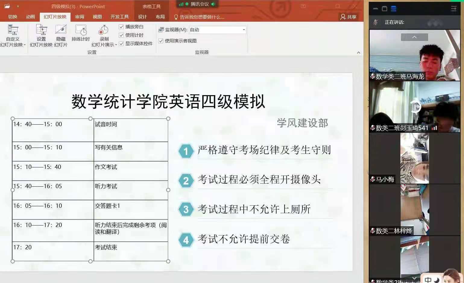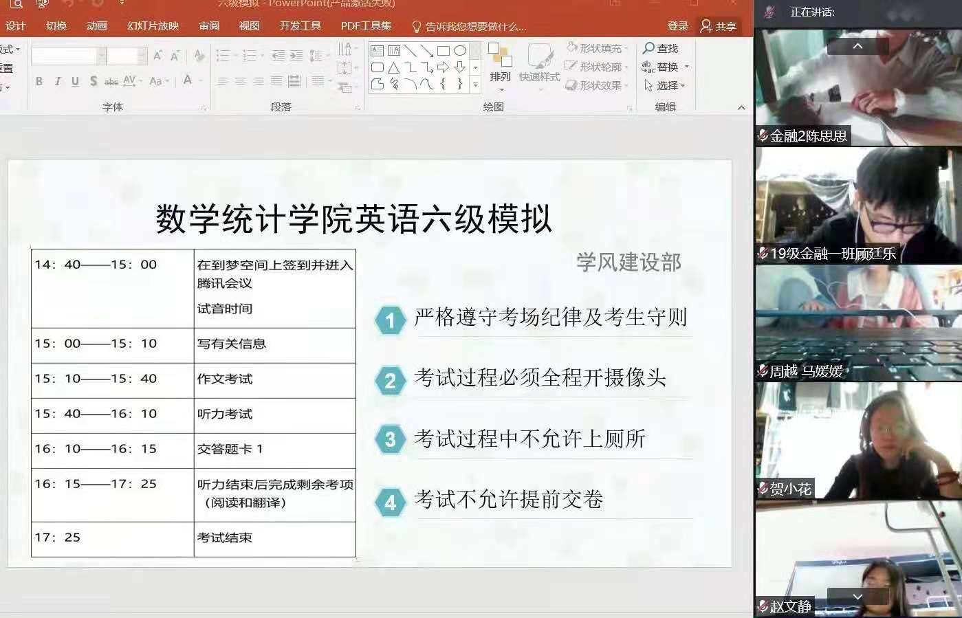 在11月14日下午14:40-17:25开展的四六级模拟考试过程中,未出现有扰乱考场秩序的情况,且本次考试严格按照英语四六级正规考试要求,模拟实战考试。虽然是通过视频线上考试,但仍可看出同学们对待此次考试态度端正、严肃认真。