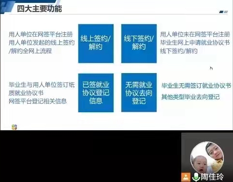 会上,首先陶老师对学生进行毕业生网上签约与毕业去向登记平台使用培训,详细地讲解了平台的登录步骤并进行现场演示,针对不同情况分别介绍了平台四大主要功能,对可能出现的问题也给出具体的解释。