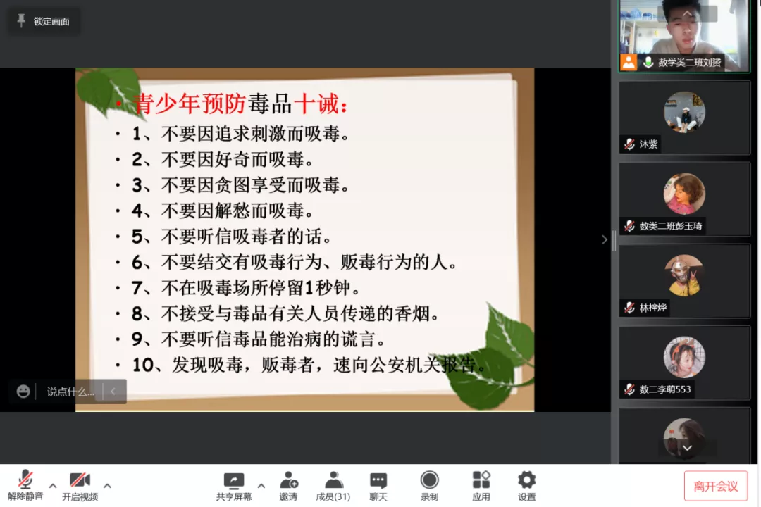 活动过程中,各团支部负责人以讲小故事和竞答等多种形式,带领同学们重温我国刑法中对毒品的定义,并通过播放“识毒,禁毒”相关视频呼吁同学们积极参与到“远离毒品,健康人生”的活动中。接着,各团支部同学积极发言,他们用真实的事例,从个人、家庭、社会三个方面向同学们讲解毒品的危害,并且告诫同学们远离毒品,同时也要擦亮眼睛、提高警惕,防止不经意间沾染上毒品。