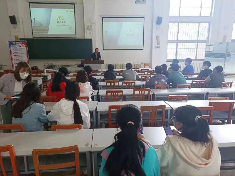下午2时30分,宁夏欣翰飞教育咨询有限公司招聘负责人初丽娟对现场学生进行简单了解后,便开始进行招聘宣讲。她主要对该公司需要招聘的岗位以及岗位的薪资待遇进行说明,其中在对岗位进行介绍时特别提到了不同岗位对应聘人员的要求。最后该公司柳婷将有意向应聘的学生邀请进招聘信息群,并告诉大家等待后面的群里招聘通知即可。