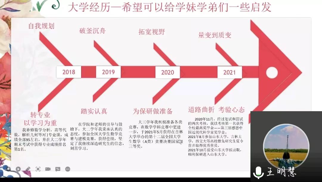 2022年4月12日,英国正版365官方网站邀请六位成功上岸的同学于腾讯会议进行线上“考研保研宣讲交流会”,为大家分享了科学的学习方法、成功的备考经验,还解答大家在备考过程中遇到的问题和困惑、帮助同学们了解考研与保研具体情况。本次分享会为有志于读研或不清楚自身是否适合读研的同学提供了很大的帮助,有助于备考的同学深入了解攻读硕士研究生的内容,为同学们的学业计划提供了可行的建议,更是助推同学们高效备考。