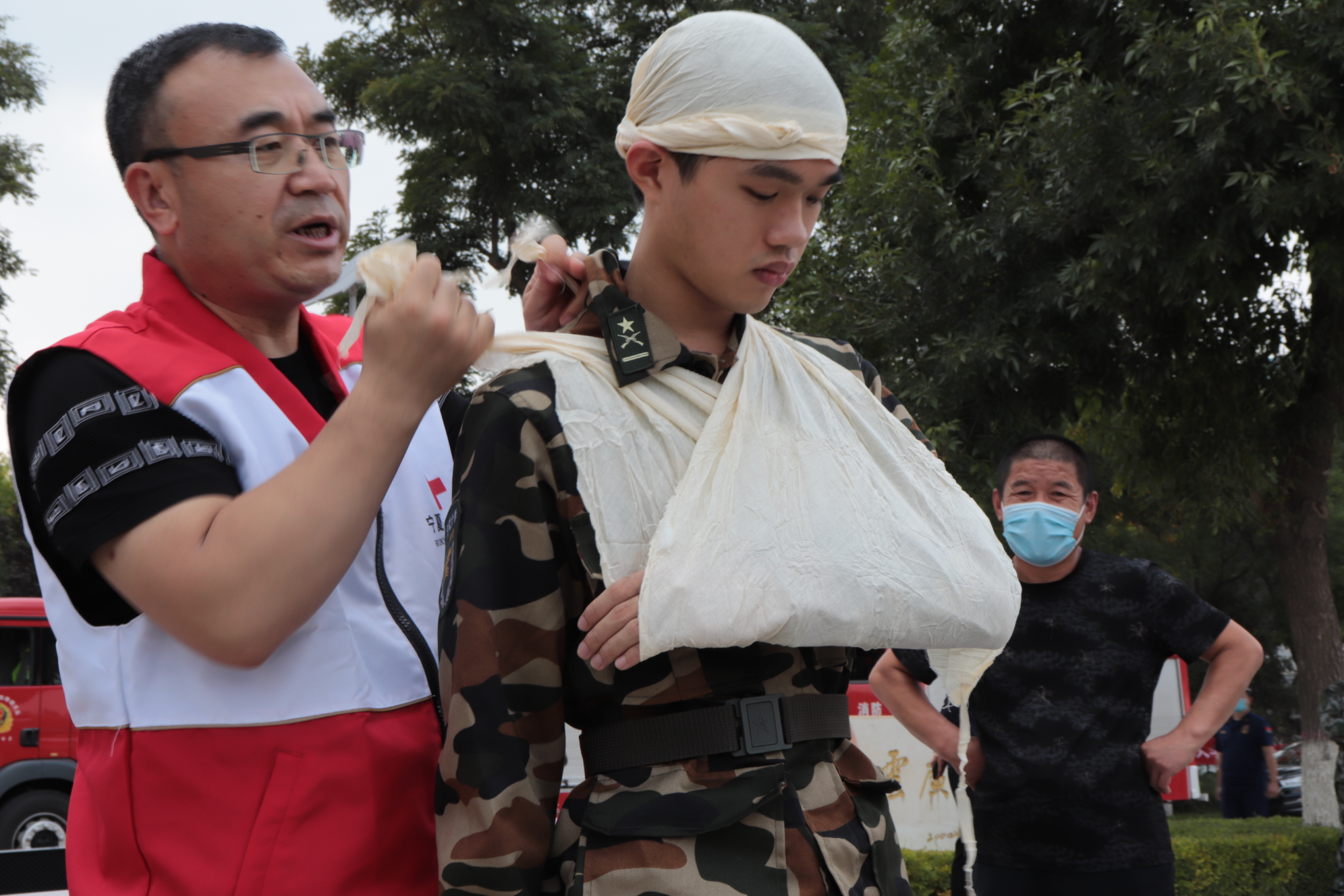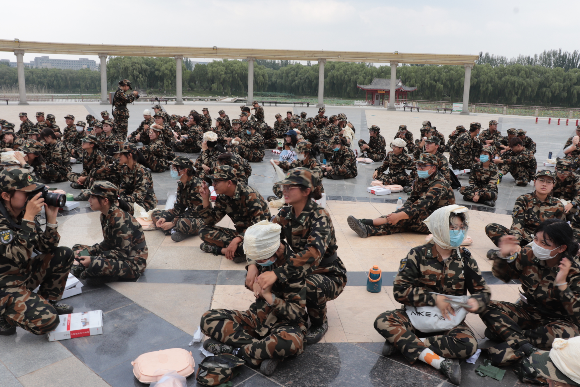 下午,我们进行了军事技能训练战场救护、消防演练、防溺水安全教育的演练活动。专业的CPR学习套装,精彩的三角巾包扎讲解和示范,令人印象深刻、收获良多。消防演练部分包括知识讲解、器材展示、问答环节。溺水教育的实战救援,从专业和真实的角度为我们展示了溺水教育的必要性。