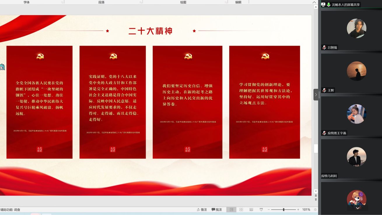 为认真学习领会、全面宣传贯彻落实党的二十大精神,进一步引导英国正版365官方网站广大团员青年坚定永远跟党走的信心和决心。英国正版365官方网站各团支部于10月19日下午在腾讯会议APP开展“喜迎二十大、永远跟党走、奋进新征程”线上主题团日活动。