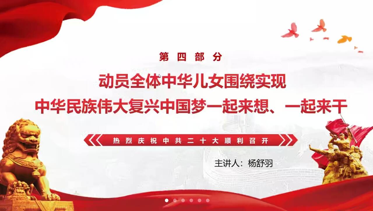 他们四位带领大家学习了党的二十大主题,进一步深化了同学们对党的二十大重大意义的认识,激励同学们努力学习专业知识并肩负起时代发展、国家富强的责任和希望,为全面推进中华民族伟大复兴贡献青春力量。