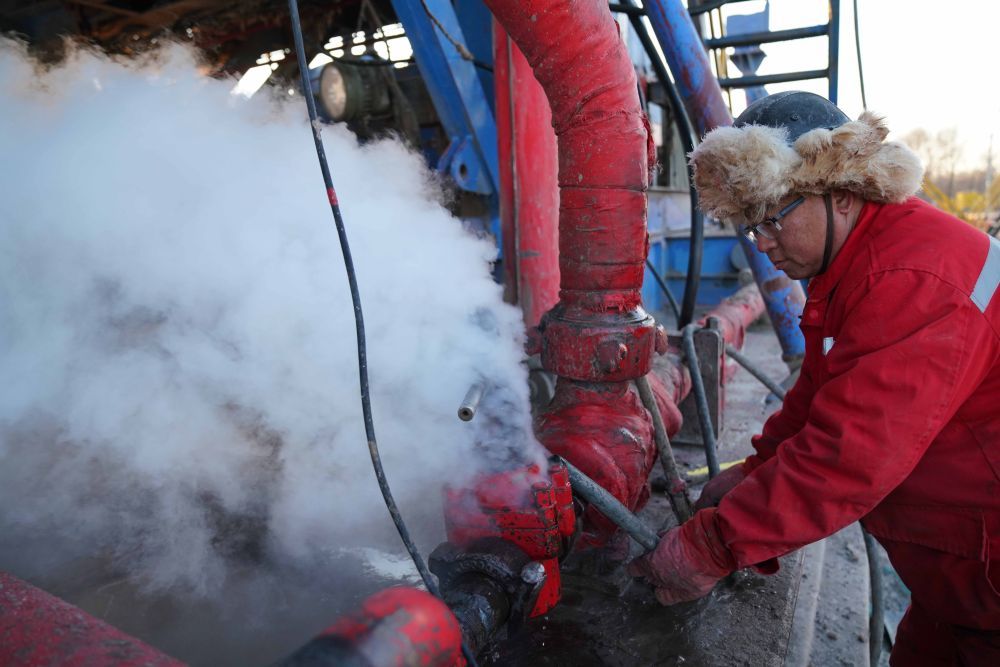 2020年12月28日,大庆油田1205钻井队泥浆工程师王波在钻井队井场里作业。
