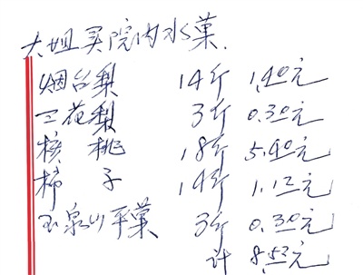 邓颖超也不例外。一张购买西花厅院内水果的付账收条上这样写道,“大姐买院内水菓(果):烟台梨14斤,1.40元;三花梨3斤,0.30元;核桃18斤,5.40元;柿子14斤,1.12元;玉泉山平菓(苹果)3斤,0.30元;计8.52元。”