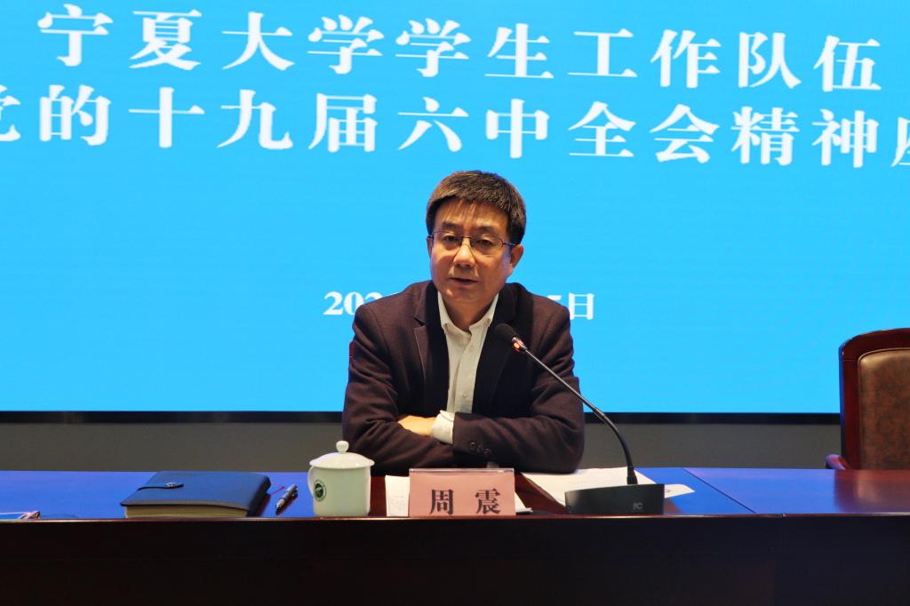 【宁夏大学新闻中心讯 姚硕/文、王佳梅/图】为深入学习贯彻习近平总书记重要讲话精神和党的十九届六中全会精神,推动我校学生工作队伍党史学习教育走实走深,11月25日,我校召开学工队伍学习党的十九届六中全会精神座谈会。校党委常委、副校长周震出席座谈会,党委学生工作部部长、学生处处长罗进德主持会议。